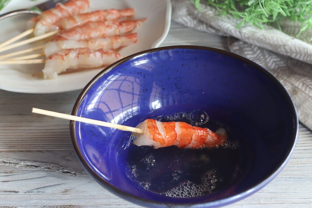 Cook in a small pot with deep oil at 340°F for a few seconds the breaded shrimp skewers.