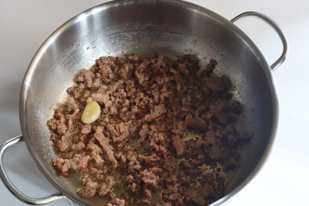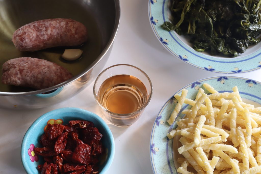 In the pan with oil and garlic, brown the sausages for a few minutes, and then deglaze with the wine. Once evaporated, add the sun-dried tomatoes and let cook for a few minutes.