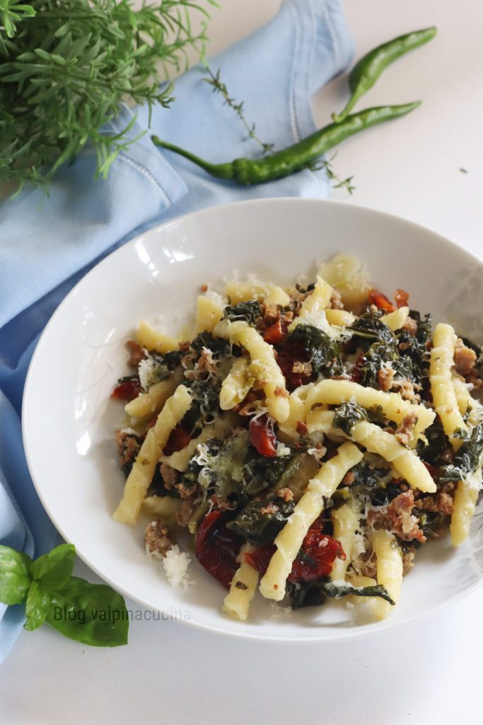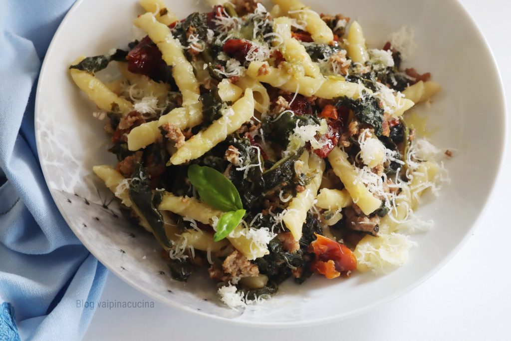 Busiate with sausage and broccoli rabe with sun-dried tomatoes for the 27th edition of World Pasta Day are ideal because they bring more than one region into a dish. Campania for the broccoli rabe, a typical vegetable of the region, as well as busiate, a Sicilian specialty. The sun-dried tomatoes from Puglia and more, you know. The sausages represent all the other regions because they are found everywhere, although those from Norcia in Umbria are a bit more renowned than others. Sausage, with its wild fennel aroma, is a very important tradition in Calabria. Also, Basilicata, with lucanica known since ancient Rome, with minced and encased meat, has significant importance. But, as noted above, this dish encapsulates the ingredients of various regions of Italy. Thus, what better occasion than World Pasta Day to propose busiate with sausage and broccoli rabe with sun-dried tomatoes? Busiate, which are produced short and long, are a type of durum wheat pasta that used to be twisted on buso branches, a grass plant, to have this shape reminiscent of Sicilian macaroni. To conclude the dish, grated aged Sardinian pecorino cheese and wine from Trentino: a nice tour of Italy almost done.