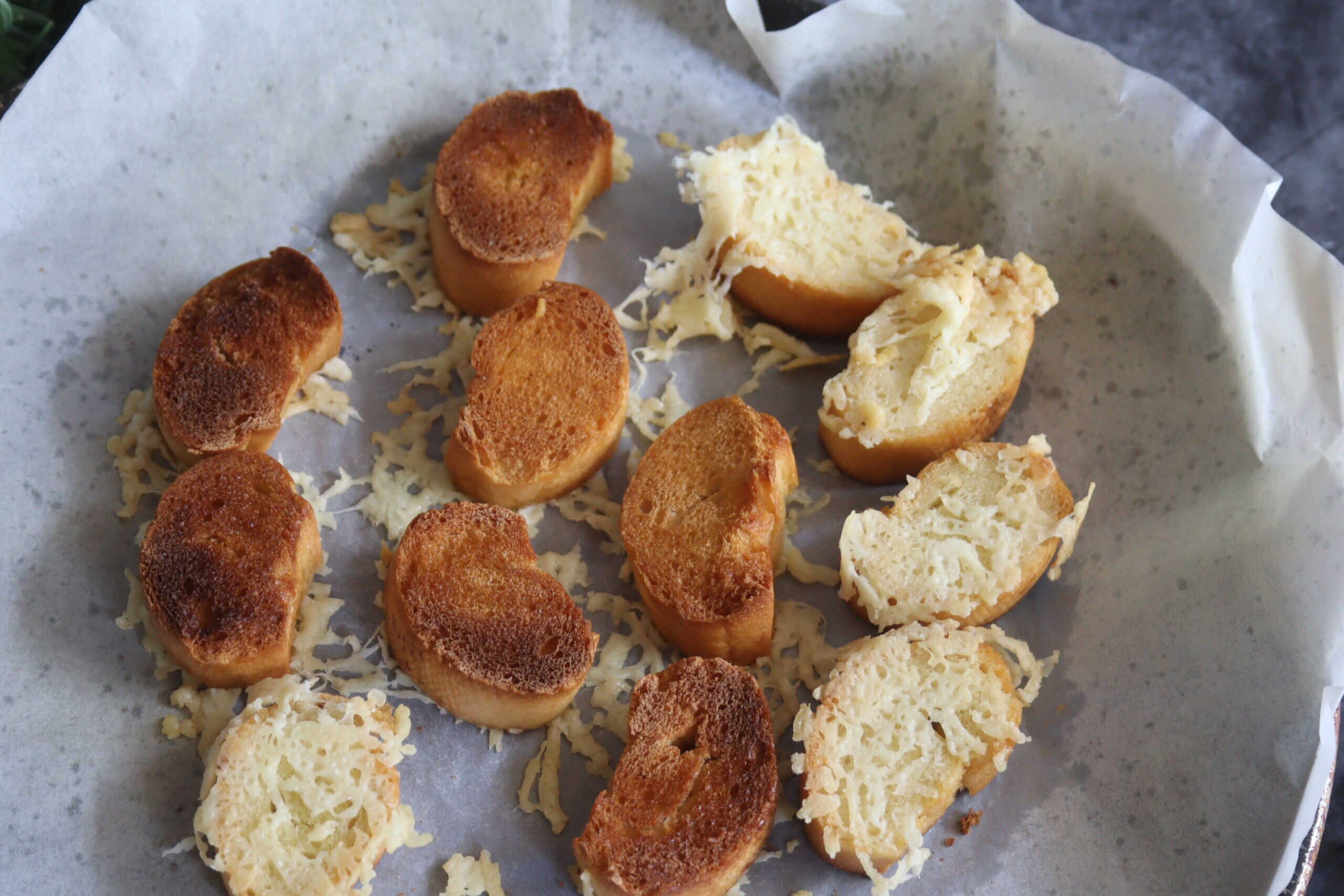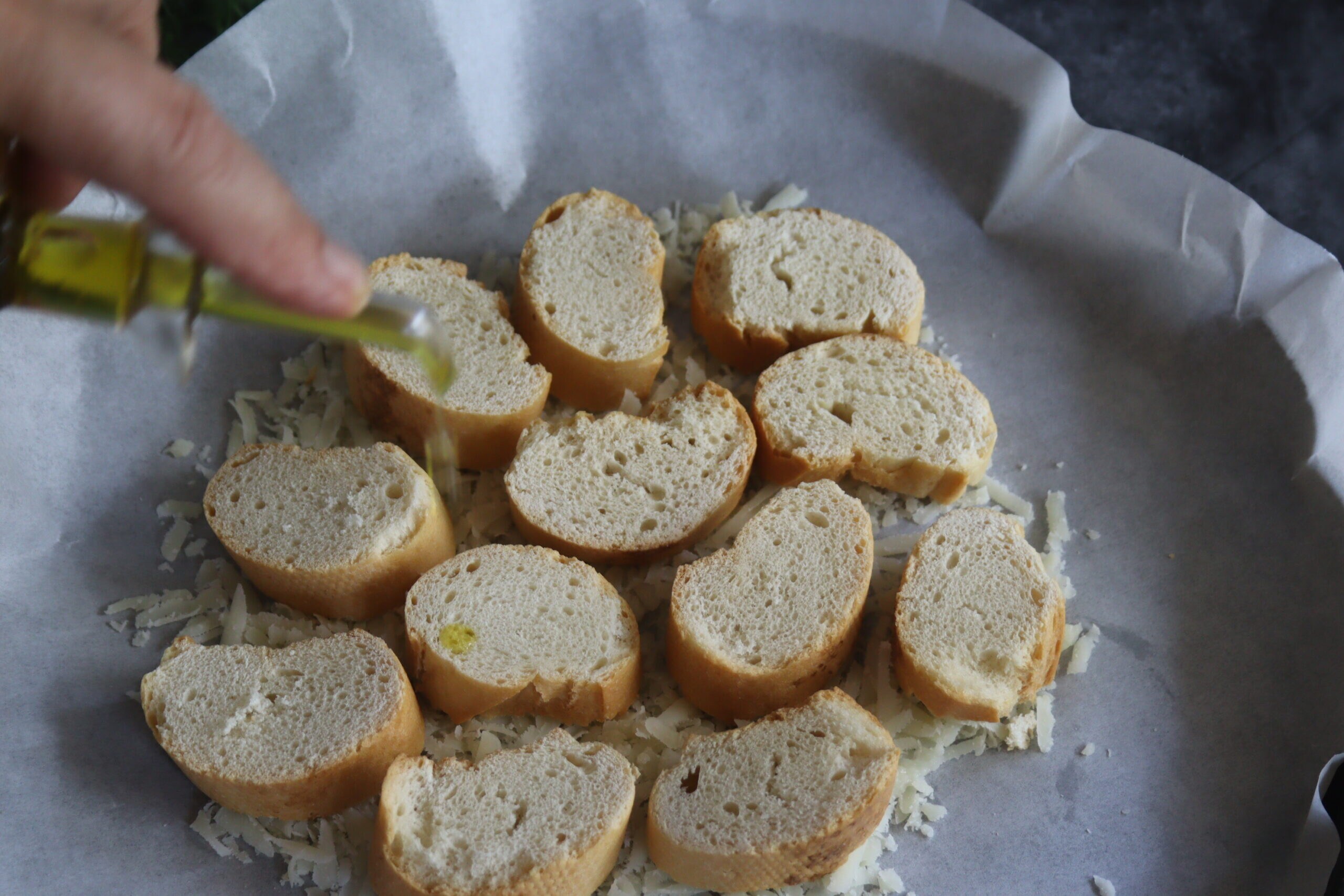 Cut the baguette into 0.6-inch slices and place it on top of the Pecorino on the parchment paper (don’t forget the ground black pepper).