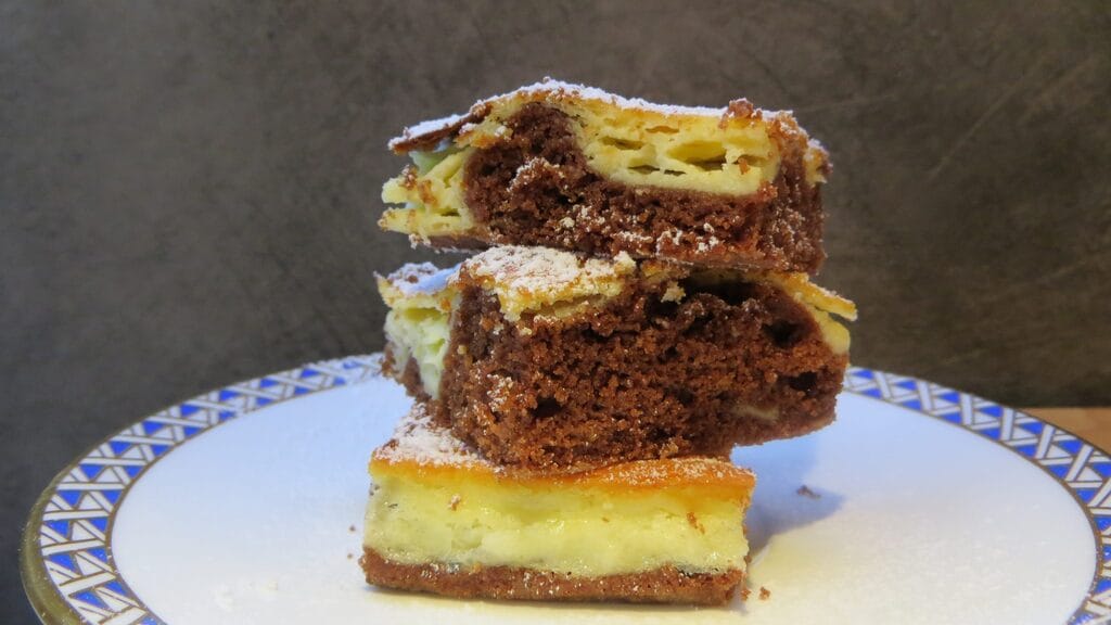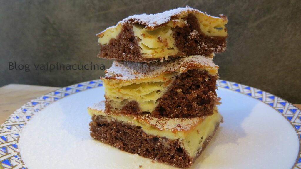 Cheesecake Brownie, or in one dessert two desserts together, a chocolate base and a creamy cheese layer. Being an American dessert, it is certainly not known for its lightness, and maybe that’s why we love it so much! My tried and tested version has yielded excellent results, I’ve tried to lighten it with simpler ingredients and simplified the execution. Keeping all the main ingredients but with small modifications. You could replace cocoa with chocolate if you like, it does not compromise the success of the dessert.