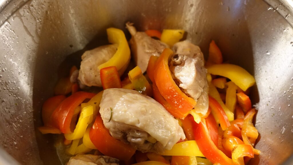 Chicken with peppers is a simple main dish to prepare with just a few ingredients: let’s say two main ones, and of course various seasonings to be added according to your habits and recipe. Chicken with peppers is now widespread throughout Italy, although its origins are from Lazio. A typical dish from the Roman countryside, it is usually prepared for the August 15th holiday, but any day of the year is always a good day to cook and offer to friends, brightening the table with its colors. Today I wanted to experiment with my lighter and quicker version of peppers. The idea came from Jessica, I’ve been following her blog for a long time, which I add here, blog.giallozafferano.it/letortedigessica, I liked the idea of the pressure cooker to speed up cooking times and use less fat. So I changed my recipe, now I’ll tell you how.