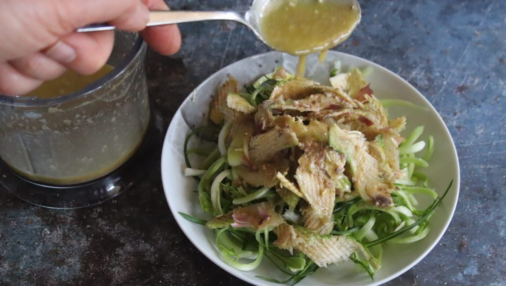 Dress the chicory shoots and artichoke salad with the anchovy sauce prepared earlier.