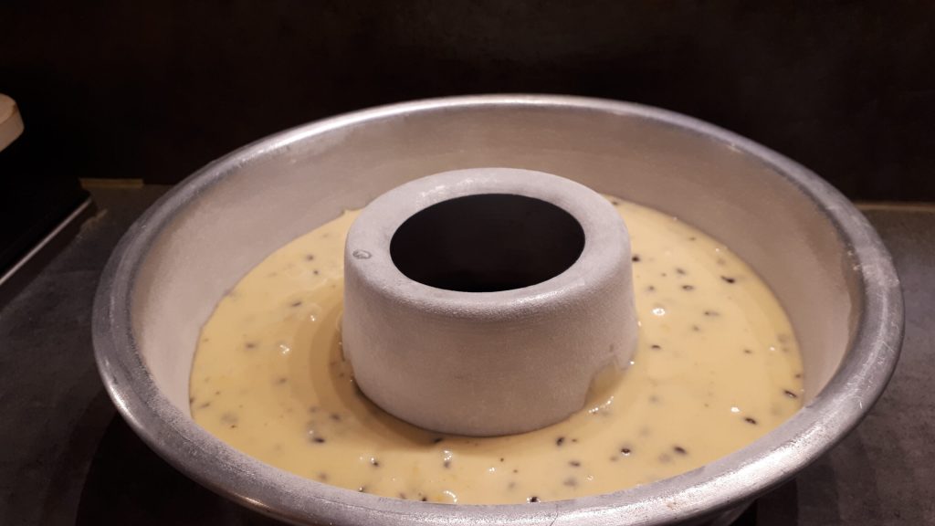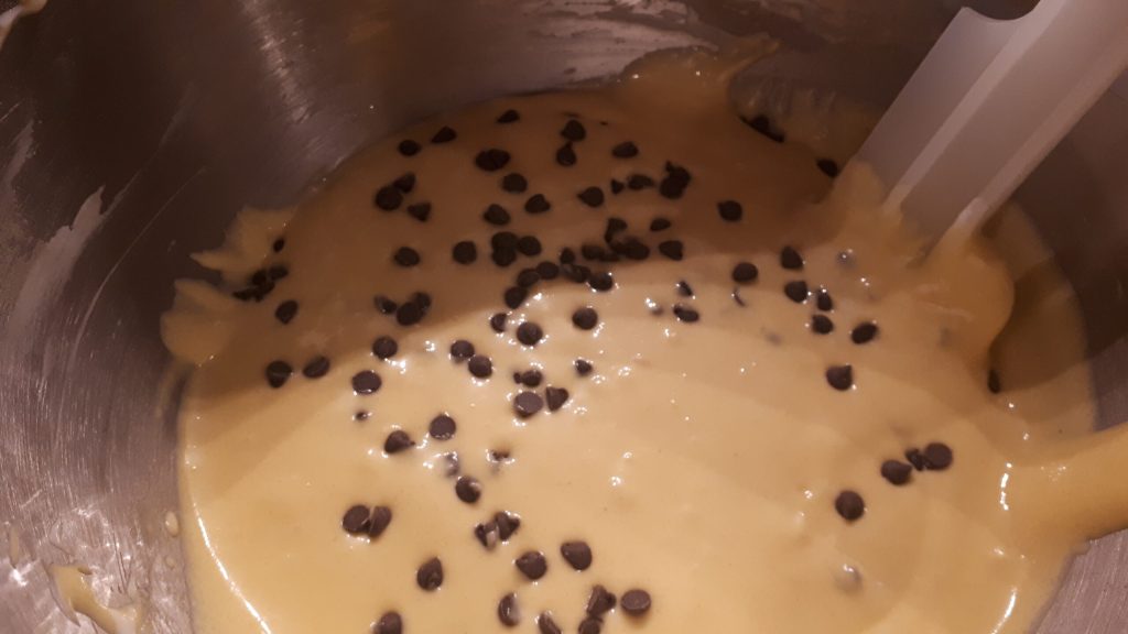 Here is your chocolate chip bundt cake ready to go in the oven!