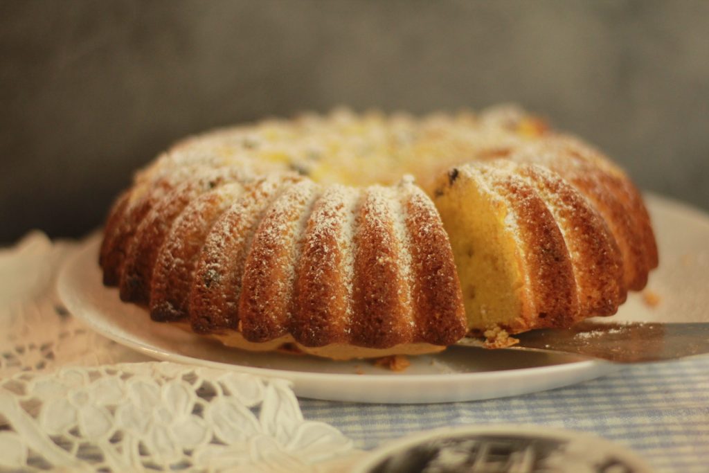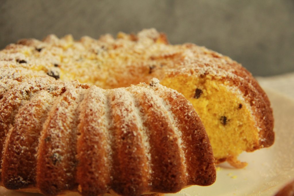 Start preparing the chocolate chip bundt cake in a stand mixer by beating the eggs with the sugar, add the grated lemon zest and vanilla. Now also add the flour, oil, yogurt, and finally the baking powder to the mixer. Butter and flour a bundt pan, before pouring the mixture into it, gently fold in the chocolate chips with a spatula, being careful not to deflate the batter.