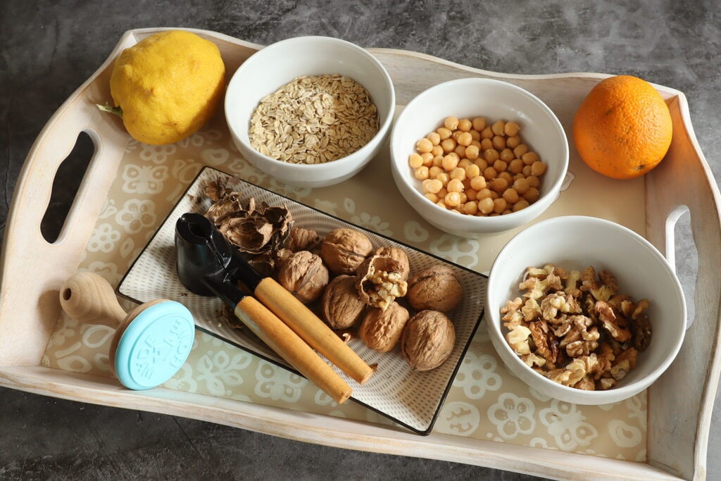 To prepare the chocolate chip cookies, you only need a blender, so start by putting the rolled oats and walnuts in the blender jar and blend until they become flour, add the chickpeas and continue blending. Add the oil with the orange juice, baking powder with vanilla powdered sugar, grated lemon and orange zest, and blend again until the mixture is homogeneous. Add the chocolate chips and shredded coconut with a spatula outside the blender.