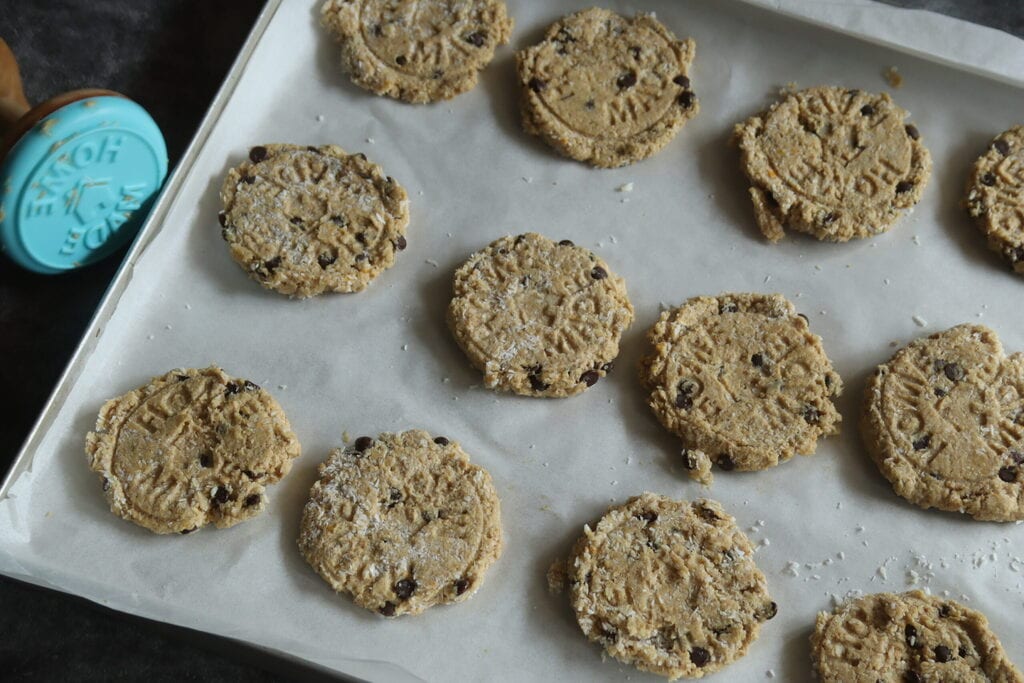To prepare the cookies, I used an ice cream scoop, after making 15 balls, I flattened them with a cookie cutter and placed them on the baking sheet with parchment paper.