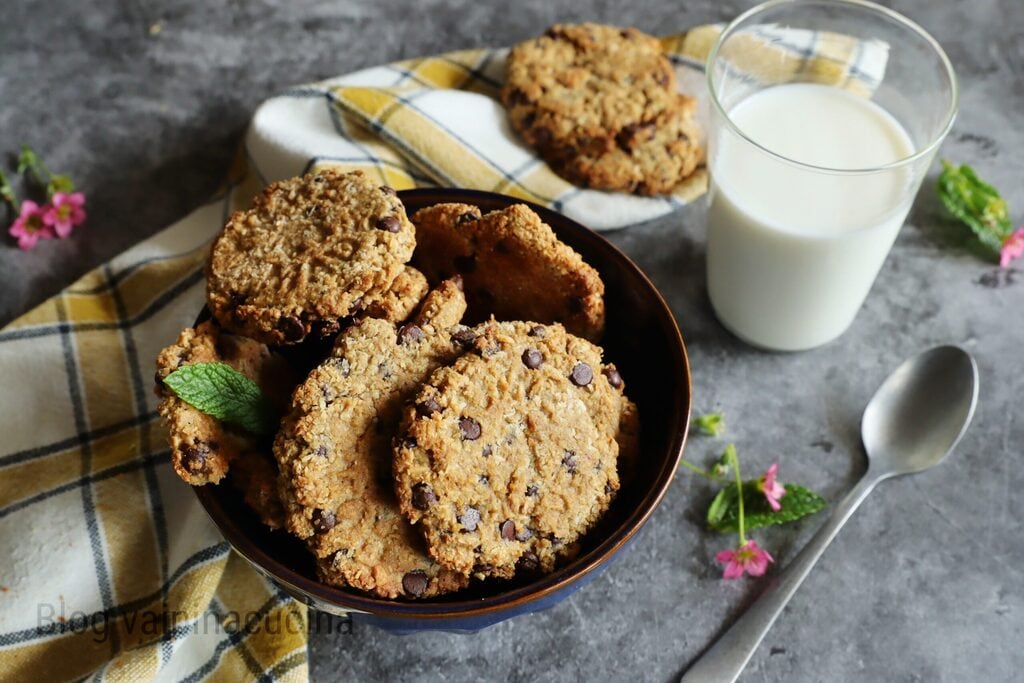 To prepare the chocolate chip cookies, you only need a blender, so start by putting the rolled oats and walnuts in the blender jar and blend until they become flour, add the chickpeas and continue blending. Add the oil with the orange juice, baking powder with vanilla powdered sugar, grated lemon and orange zest, and blend again until the mixture is homogeneous. Add the chocolate chips and shredded coconut with a spatula outside the blender.