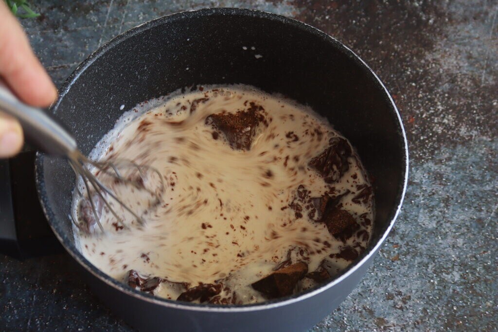 To prepare the ganache cream, I need 2 tablespoons of fresh cream and 2 tablespoons of dark chocolate. I prepare it immediately so that it cools down until ready to use to cover the no-bake truffles