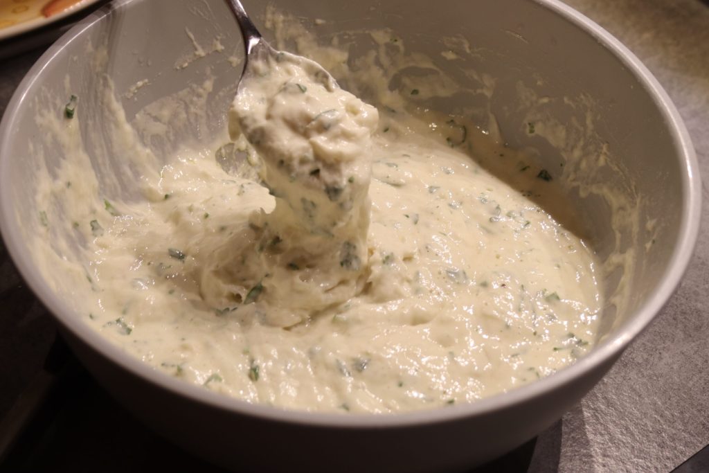 Add the minced cod flesh to the batter, mix gently and let it rest for a few minutes.