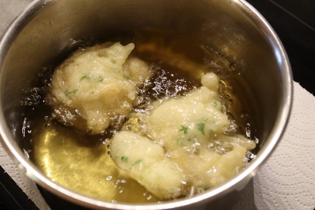Meanwhile, heat the extra virgin olive oil and fry spoonfuls of cod batter. One more idea could be using brewer’s yeast instead of dry yeast, but you would need to let the cod batter rest for at least thirty minutes.