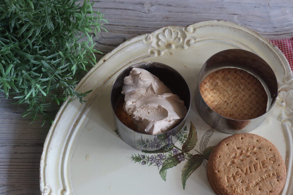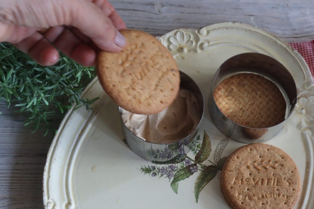I lined a tray with plastic wrap and placed the cookie cutters, I have two of the same size. I inserted the biscuit with the writing in the cookie cutter and immediately the coffee cream