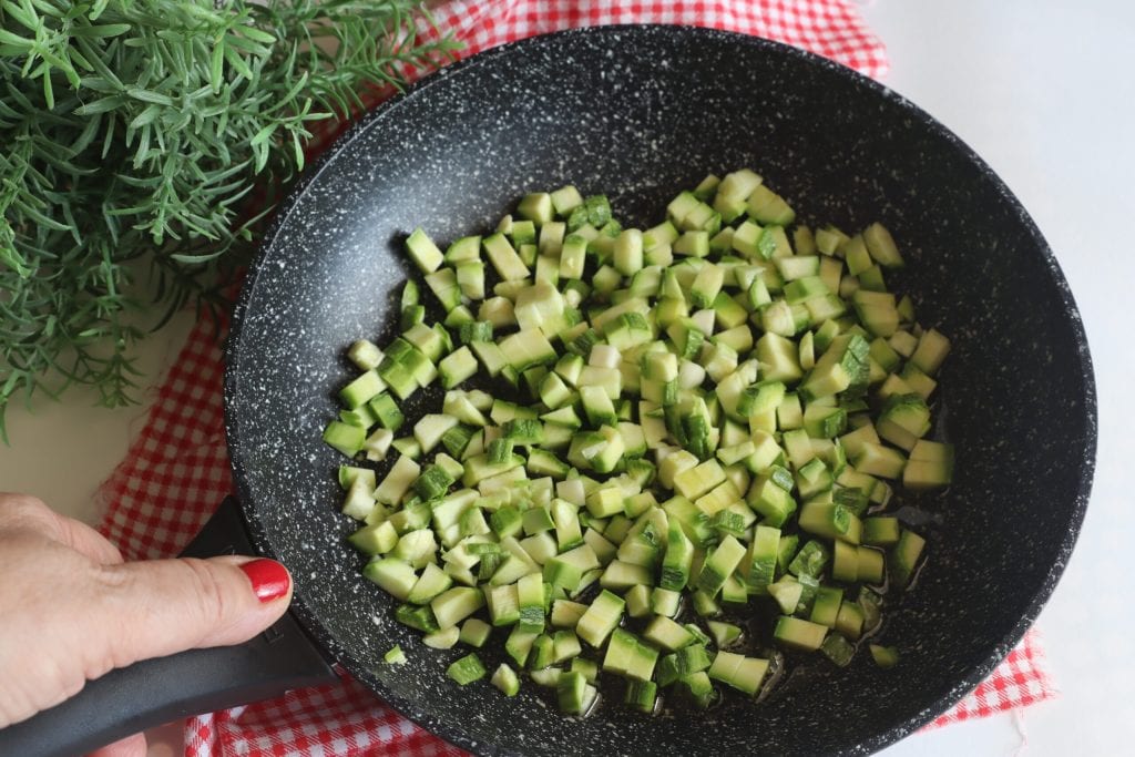 Wash and dice the zucchini into small cubes using a vegetable cutter; place them in the pan with a tablespoon of oil.