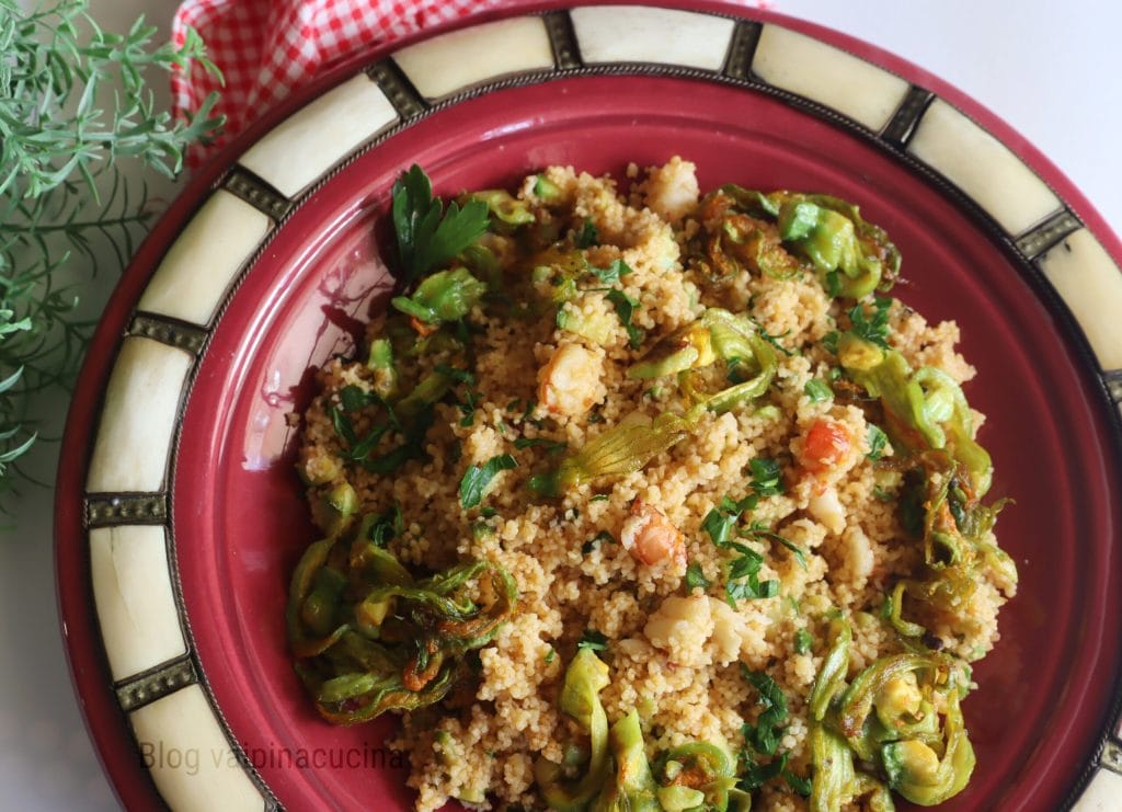 Couscous with prawns and zucchini, a nutritious, simple and light dish, naturally recommended during hot periods like summer, when we don’t feel like spending much time in the kitchen and thus can prepare it in advance. A good substitute for cold pasta or rice salad, couscous is well suited for a cold dish with vegetables or fish, but also both. Couscous is derived from durum wheat processed with water until forming grains, and it’s certainly a very difficult operation that only expert hands can accomplish. Fortunately, today precooked versions are available in the market, only to be rehydrated and seasoned to taste for cold or warm dishes. The origins of couscous date back to around the 8th century AD among the Berber populations in Algeria, Morocco, and Tunisia, and by the 11th century in the entire Mediterranean area, including Sicily.