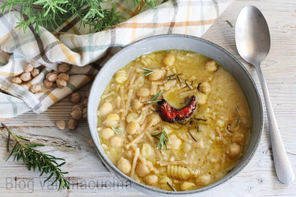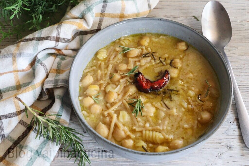 • The evening before preparing pasta and chickpeas, I soak the chickpeas in plenty of cold water. The next morning, I wash them and put them in the pressure cooker with a clove of garlic and a sprig of rosemary, cooking them over medium heat for 25 minutes from the moment of boiling. After the time has passed, after checking the cooking, I remove a cup of chickpeas from the cooking water and puree them in the food processor. I put the chickpeas with the cooking water in a pot, add the salt, and when it comes back to a boil, I add the mixed pasta. I used leftover opened pasta packs, even long ones, breaking them. Meanwhile, in a saucepan, I put the oil with the garlic and rosemary and let them brown before adding them to the pasta and chickpeas along with the prepared chickpea cream.
