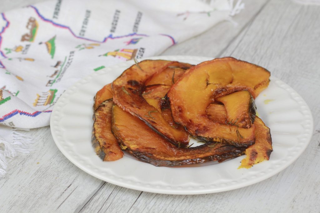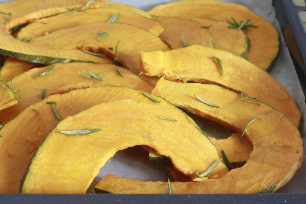 • Slice the pumpkin thinly with the skin on.