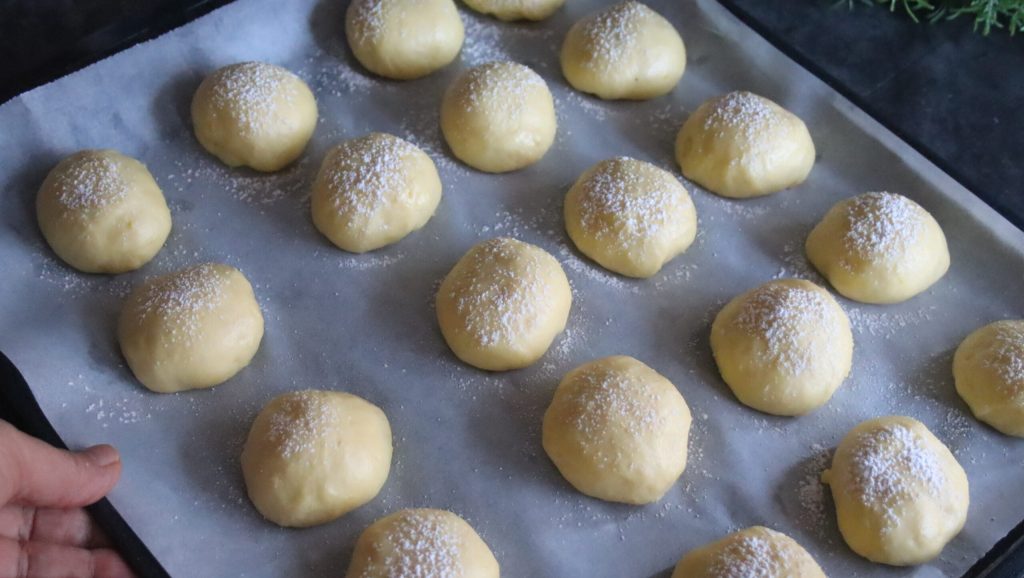 After the rising time, take the dough, pass a piece of butter on the work surface, and start preparing small buns of about 0.7 oz each. I made 30.