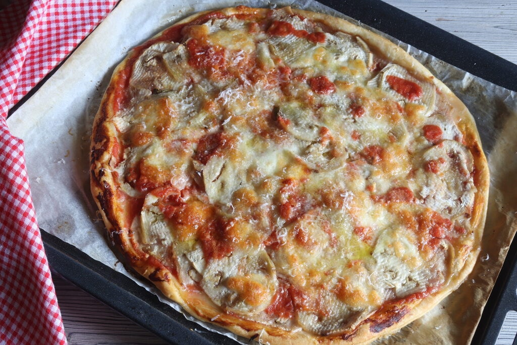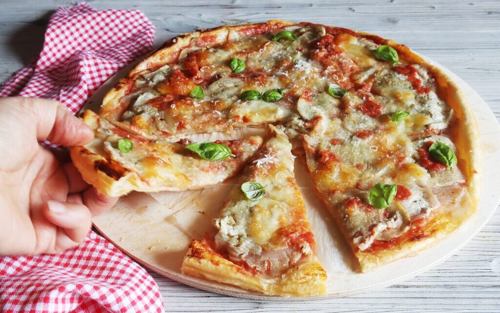Few steps to prepare eggplant parmesan in puff pastry. The first thing to do is to use scissors to open the package that protects the puff pastry, unroll it with all the parchment paper and place it directly on the baking tray.
