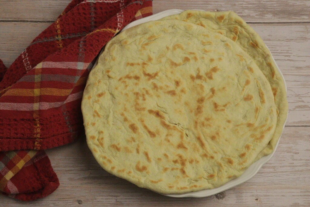 Heat the griddle (a pan works too), and once it’s hot, cook the flatbread for a few minutes. Flip it and cook it again until you see small bubbles.