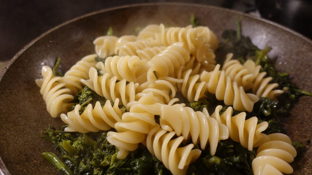 Cook the fusilli very al dente to finish cooking in the pan with the broccoletti and pecorino.