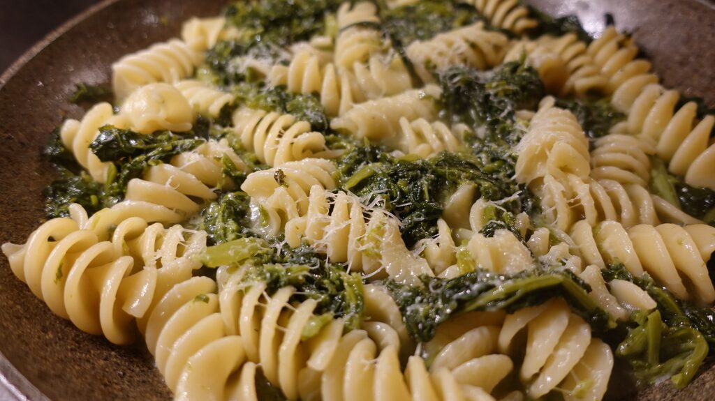 Fusilli with broccoletti and pecorino, a humble dish from the southern countryside tradition. Broccoletti are cultivated in several southern Italian regions like Apulia, Campania, and Calabria, but they can also be found in parts of southern Lazio. This wonderful vegetable also grows wild as mentioned in the south. Just imagine the aroma while cooking with garlic and chili, also try it as an alternative on a slice of toasted bread with broccoletti for a quick snack.