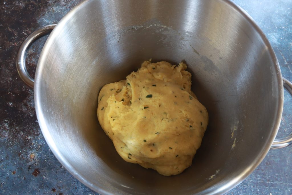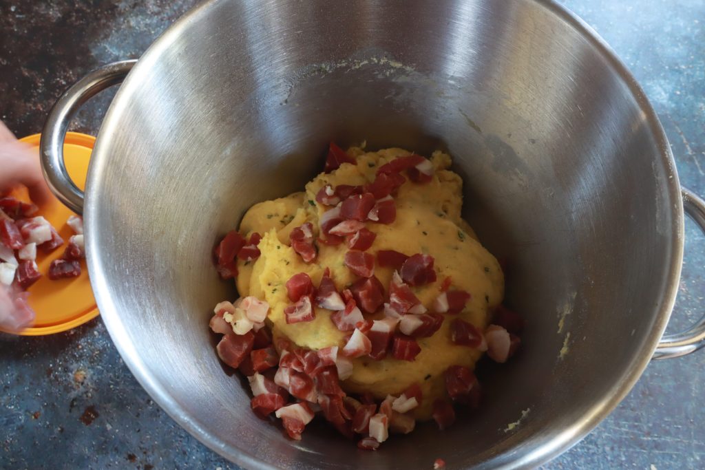 I also fold in the gambuccio, chopped as finely as possible with the knife. This is why I only added a pinch of salt to the dough earlier.