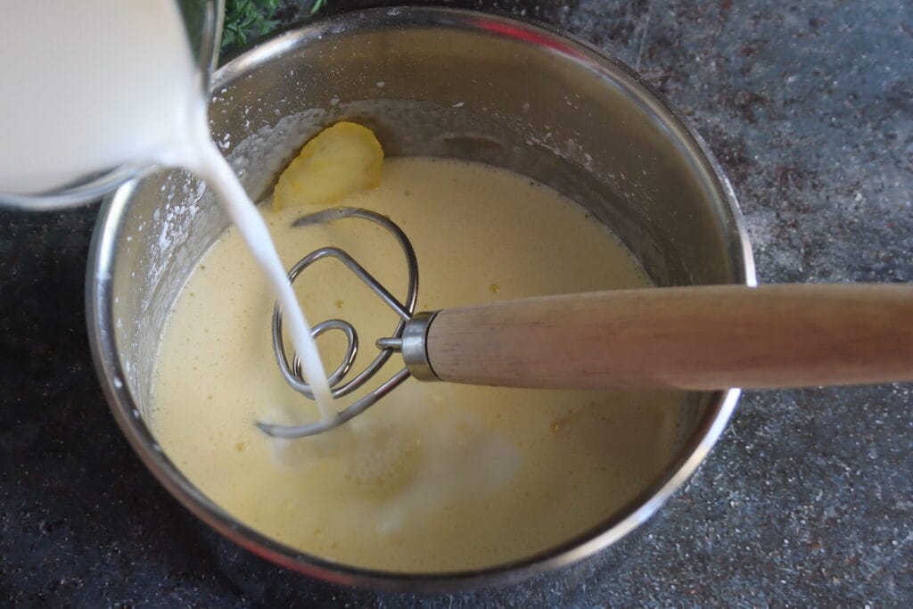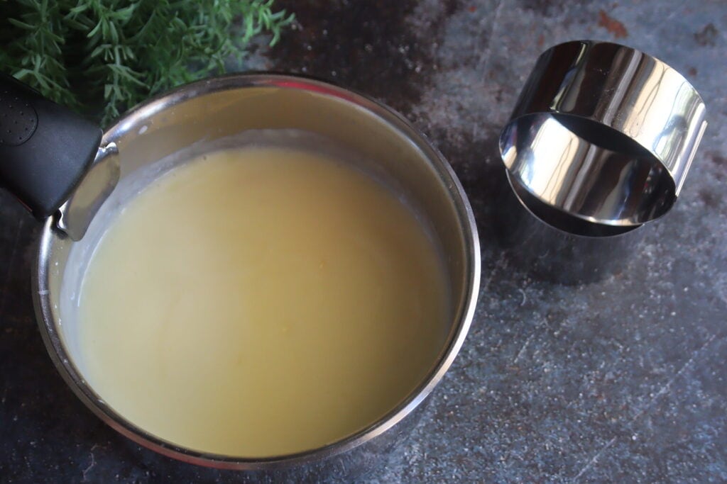 Add the lemon zest (which you will remove later), pour in the milk, and cook over low heat until it thickens, about ten minutes. Once ready, pour the custard into a bowl and cover it with plastic wrap directly in contact with the custard.