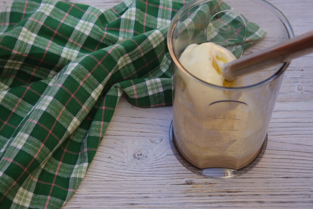 Prepare a light sauce by putting the soy milk in an immersion blender glass, (if you prefer another type, that’s fine too) and the oil with