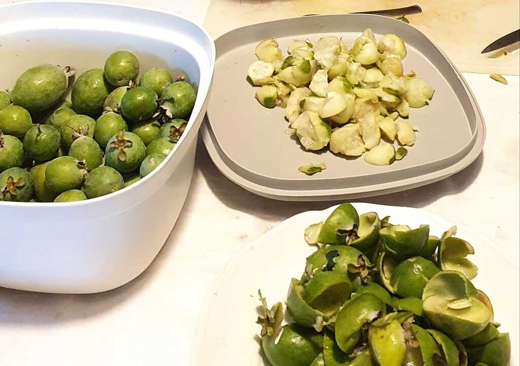 The first step, obviously after washing them, which takes a bit longer, is to peel the feijoa fruits.