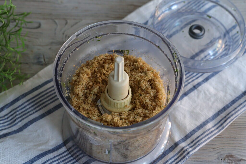 • In the chopper, add the breadcrumbs with garlic, parsley with the anchovy fillets, grated lemon zest with salt and oil. Optionally, you can also add paprika and ground black pepper.