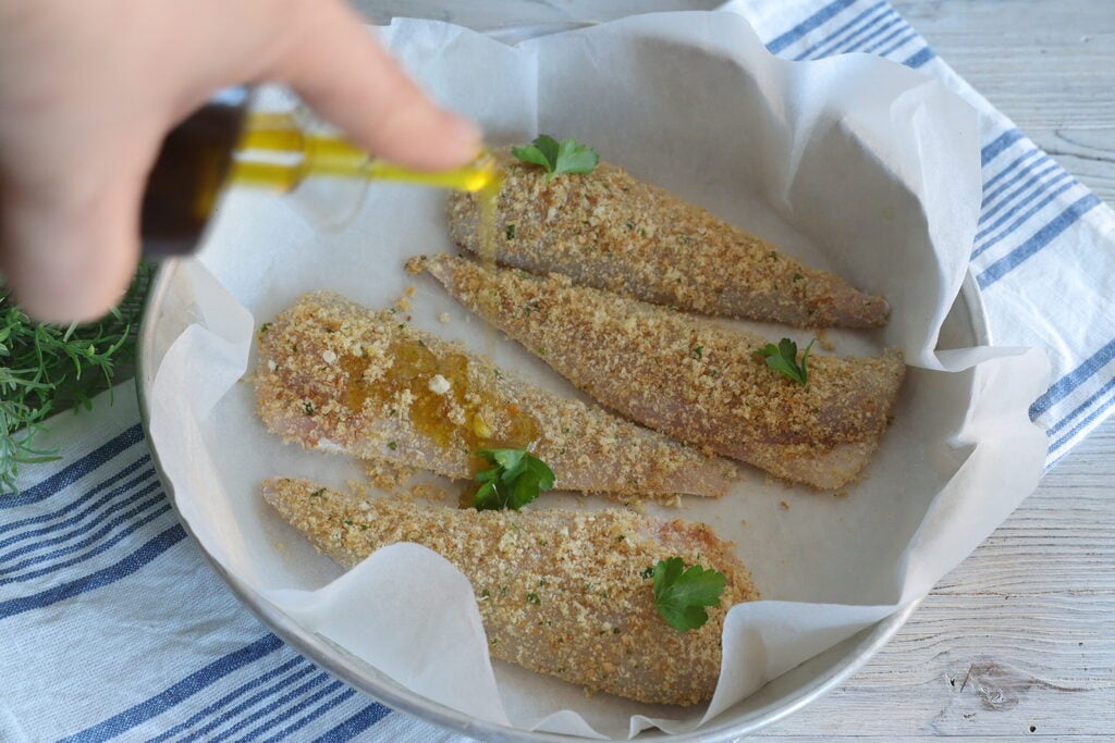 • Place the breaded gurnard fillets on a baking tray with parchment paper, and season them with oil and parsley,