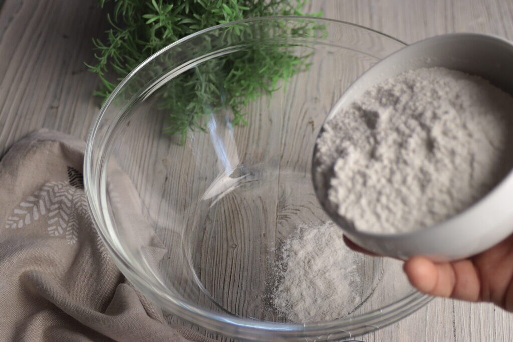 I prepare a nice large bowl to collect all the ingredients, first adding the dry ingredients like the flour,
