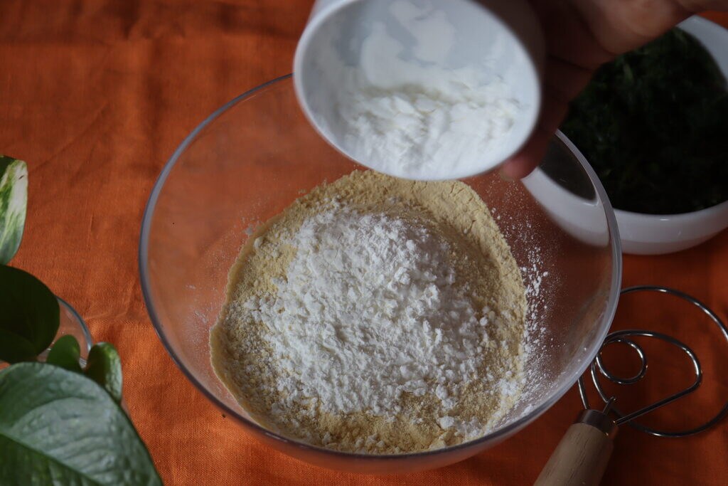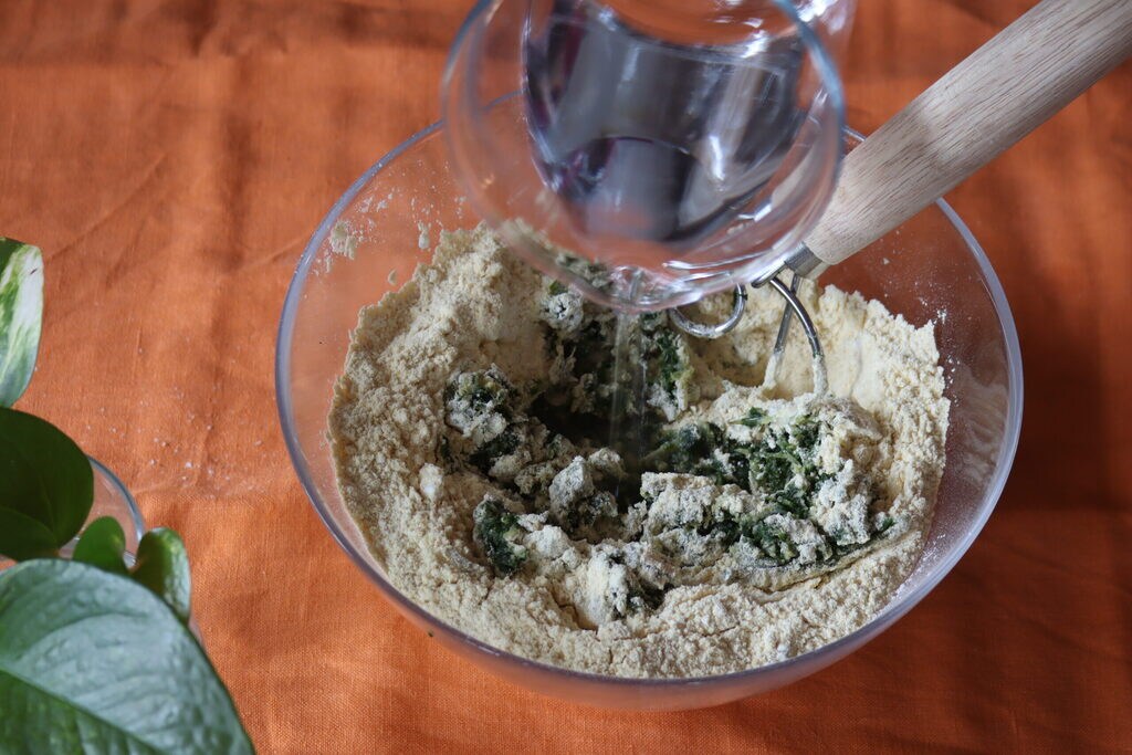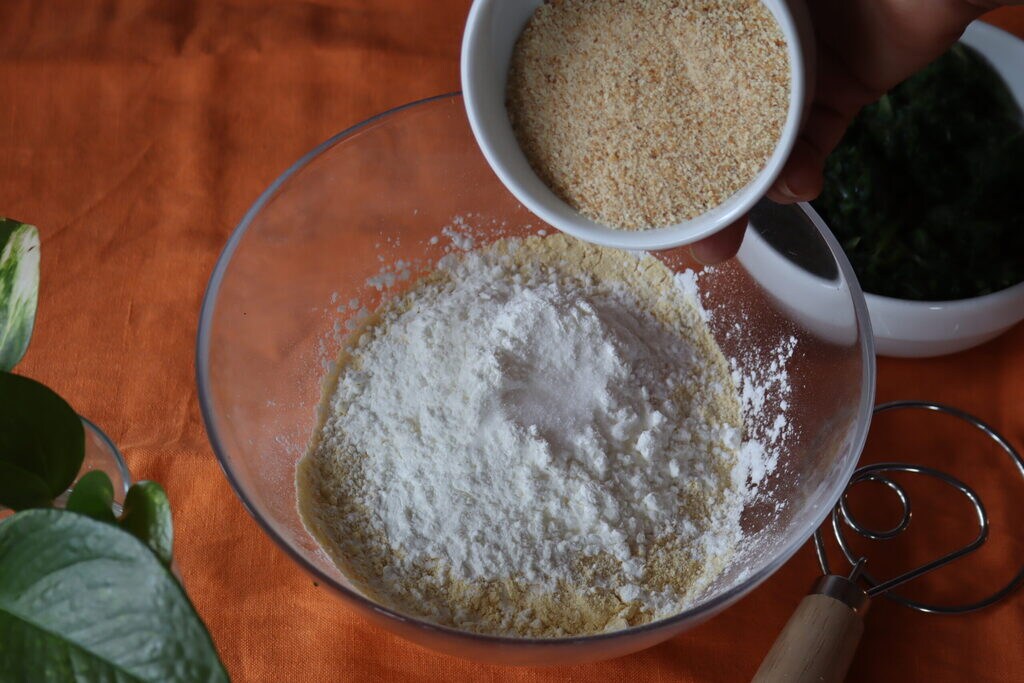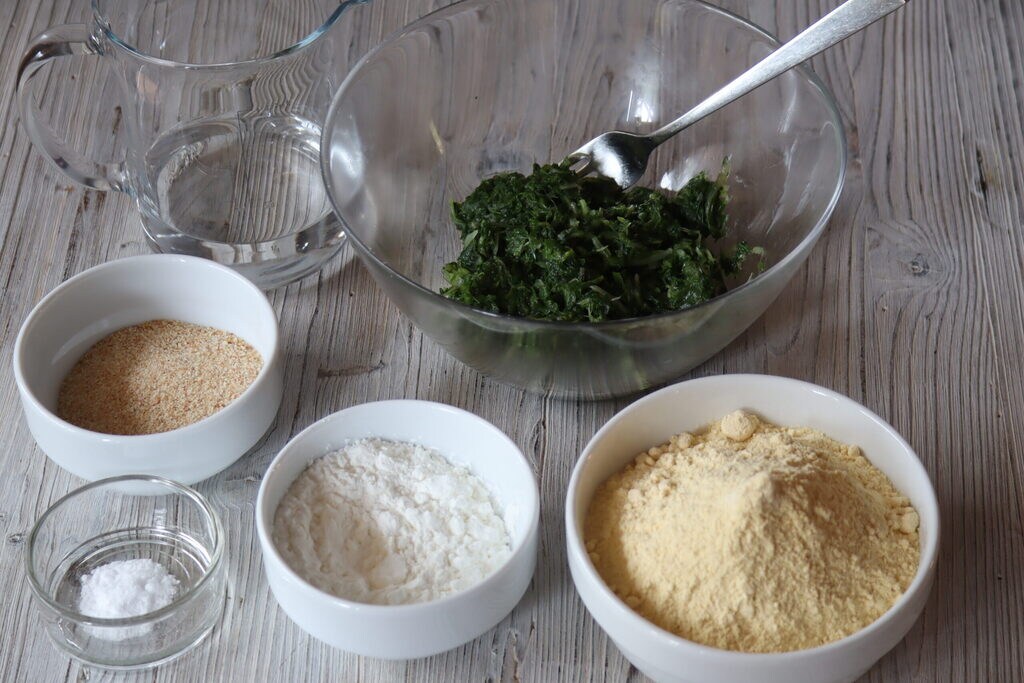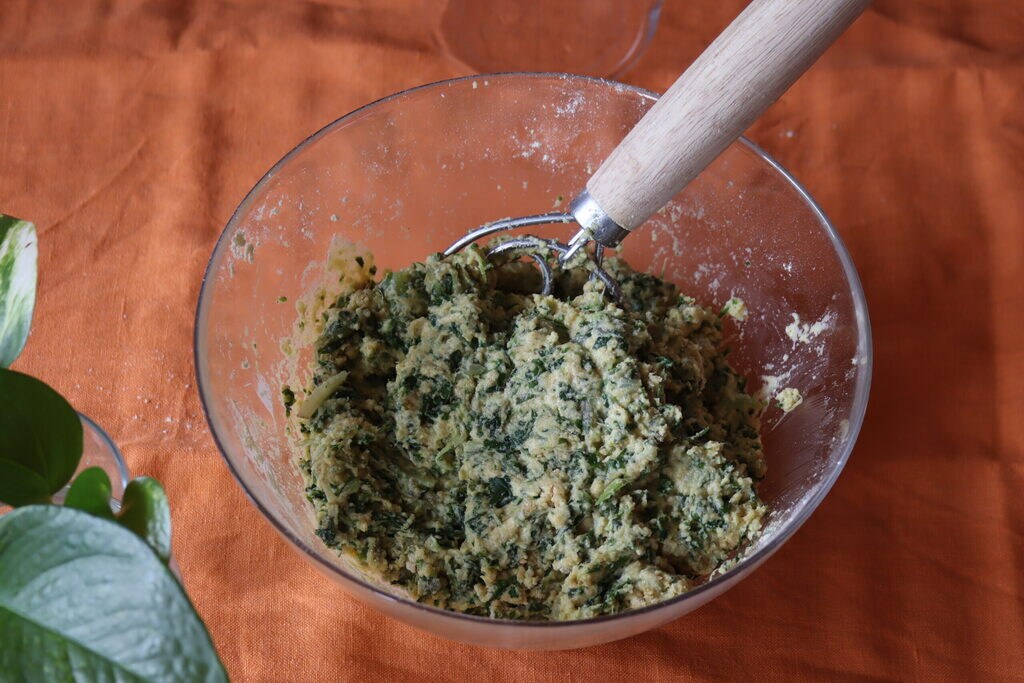 Prepare a mixture with chickpea flour, breadcrumbs, cornstarch, salt, a pinch of baking soda, and mix well. Add water, and if you like, also paprika or black pepper. I made these for the kids, so I didn’t add black pepper or paprika. Add the cooked and chopped Swiss chard. Prepare 4 balls, flatten them, and coat them in breadcrumbs or panko. I love cooking and thus also changing ingredients, adding some but also removing others. For cooking, if you have an air fryer, that works too, for 15 minutes at maximum power, or fry them in a pan with peanut oil.
