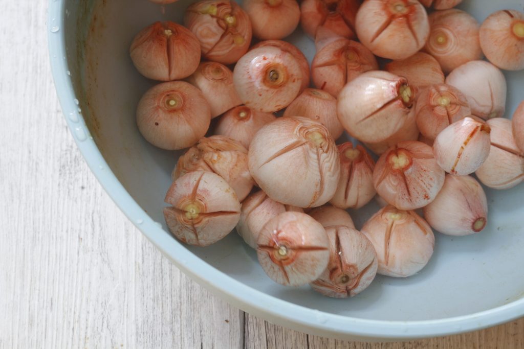 How to prepare pickled lampascioni, I’m going to explain it in my own way, which obviously doesn’t mean it’s the perfect way, but I’ll try to stick to the local rules for preparing pickled lampascioni. Here’s what the lampascioni looks like, the onion of the Muscari family, the outer part is very dark and covered with soil, let’s say it doesn’t look very good and for this reason, they need to be cleaned well of all the external soil, while the inside is pink and we will discover this after a thorough cleaning. The lampascioni has a very bitter aftertaste, let’s say that this is what makes it appealing and sought after. We can add that the best way to taste and preserve it is in oil after a quick boil in water and vinegar. I also add that since I tried them for the first time, I can’t help but make them every year.