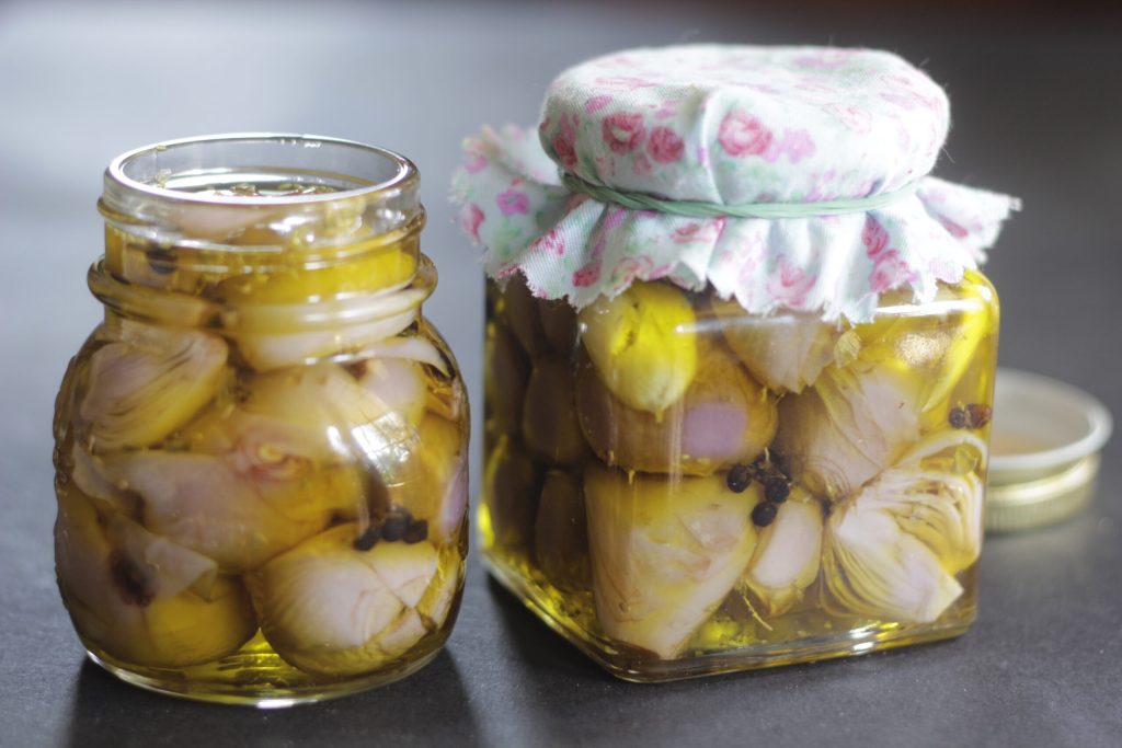 • Place the lampascioni in jars with extra virgin olive oil, black peppercorns, and garlic with dried oregano. You can gently mix everything in a bowl and then place them in jars, always adding enough extra virgin olive oil to cover them completely.