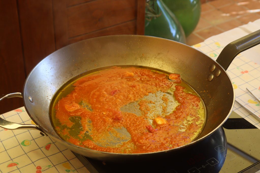 Being careful not to burn yourself, dip a bit of tomato purée in the boiling oil.
