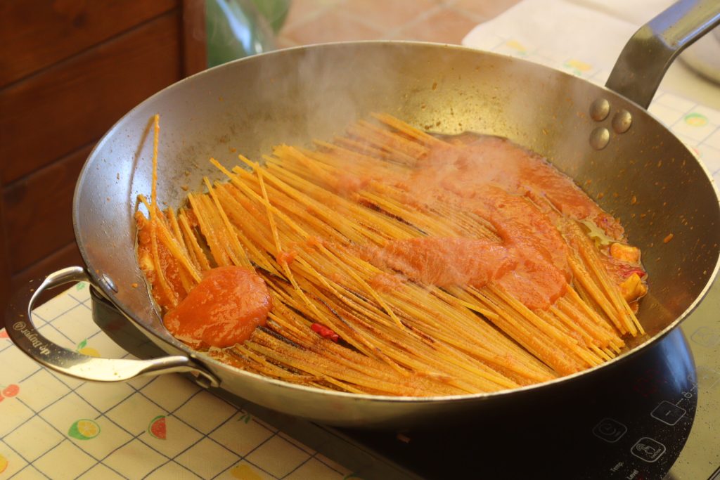 After two or three minutes, lay the whole spaghetti on the tomato in the pan, remember, and this is why the iron pan must have a diameter of 14 inches.