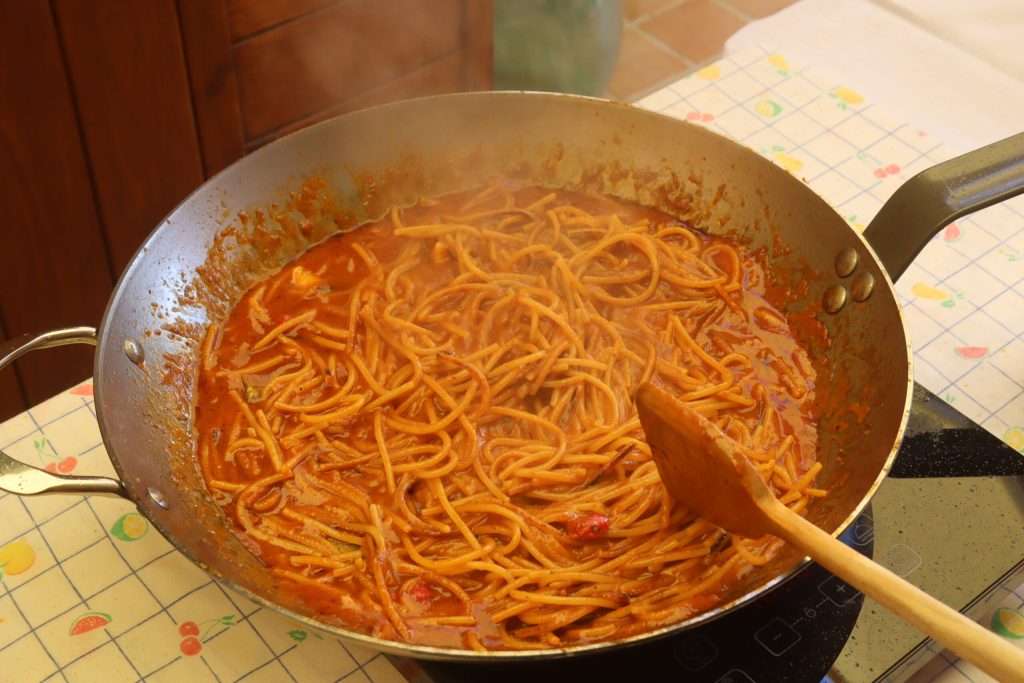 Killer Spaghetti is a young first course of Bari origins, born in 1967 by the hand of a Puglian chef, Enzo Francavilla. Initially, the spaghetti was blanched and then cooked in a pan directly with peeled tomatoes. Later, it was decided to replace the peeled tomatoes with water and concentrate and put the raw spaghetti directly. Very appreciated not only in the region of birth but a little everywhere. Spaghetti always remains the most preferred format for everyone. They are called so because of the way they are cooked, with lots of chili peppers fried together with spaghetti and from the exclamation of a customer addressing the host who had prepared them, calling him an assassin. The first ingredient is chili pepper, lots of chili pepper, and of course, the iron pan is indispensable. I also bought it, I add the link here. At this moment I checked, it is on sale at 20% off, take advantage