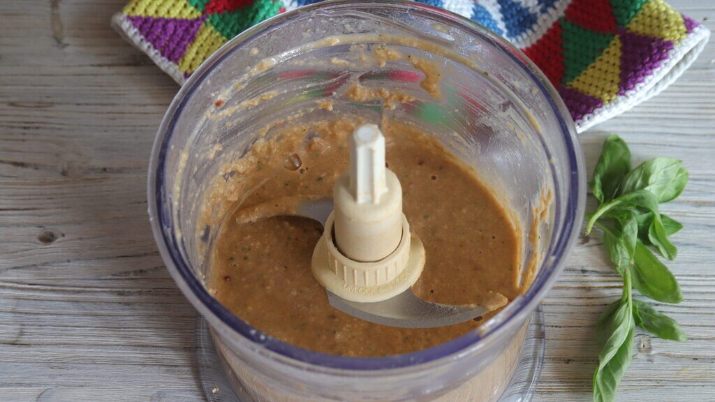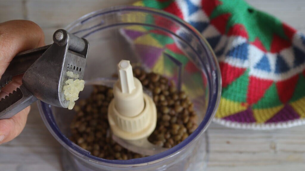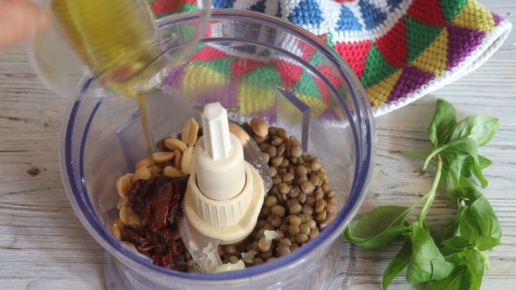 • I put the lentils in the chopper along with crushed garlic, peanuts, and sun-dried tomatoes.