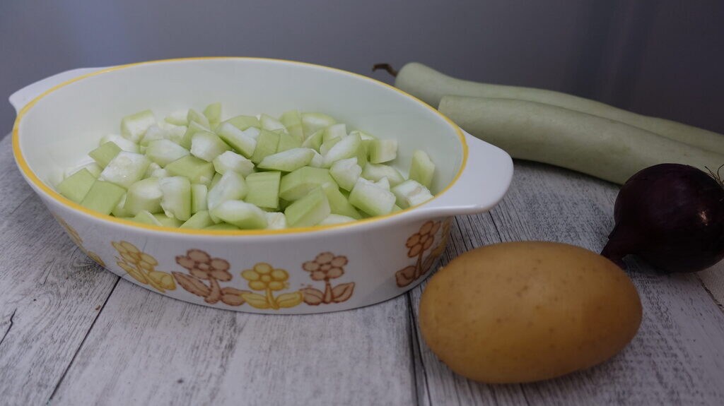 • Cut the zucchini into cubes after peeling it. Do the same with the potatoes. In the pan, add all the ingredients starting with the onion, then zucchini, potatoes, and tomatoes. naturally oil, salt, and water.
