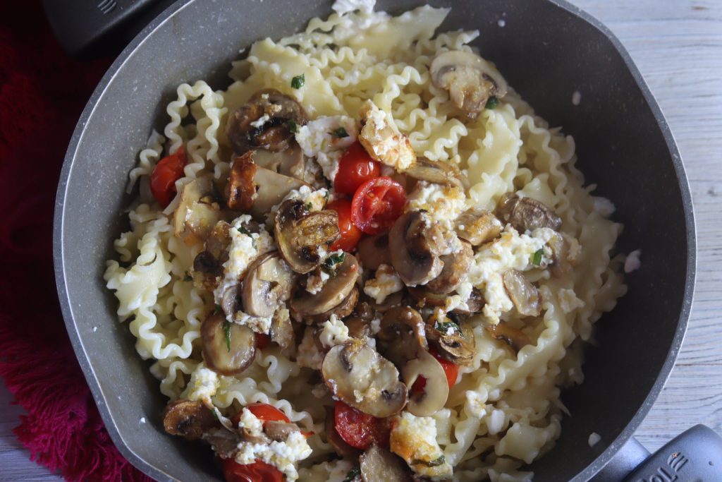While still hot, I added the quartirolo cut into small cubes to the mushrooms, seasoned with extra virgin olive oil and parsley, some halved cherry tomatoes, and finally, a light sprinkle of breadcrumbs.
