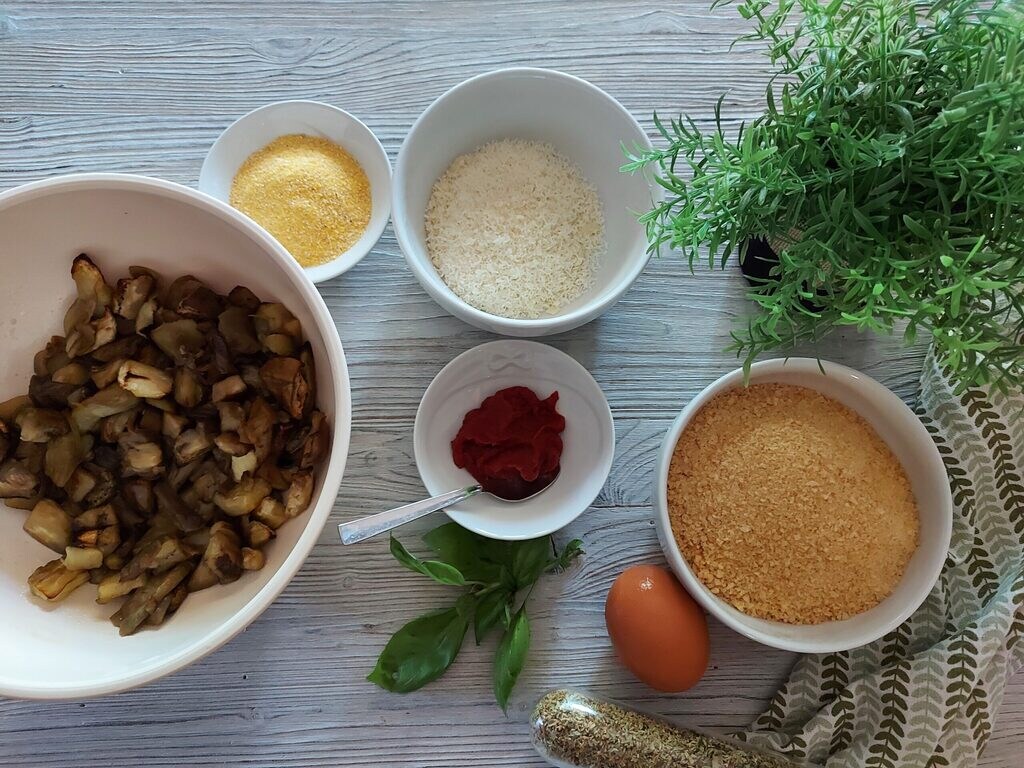 Let them cool and then slightly mash them in a bowl, add the oregano, breadcrumbs, eggs, tomato paste, salted ricotta, torn basil, and corn flour.