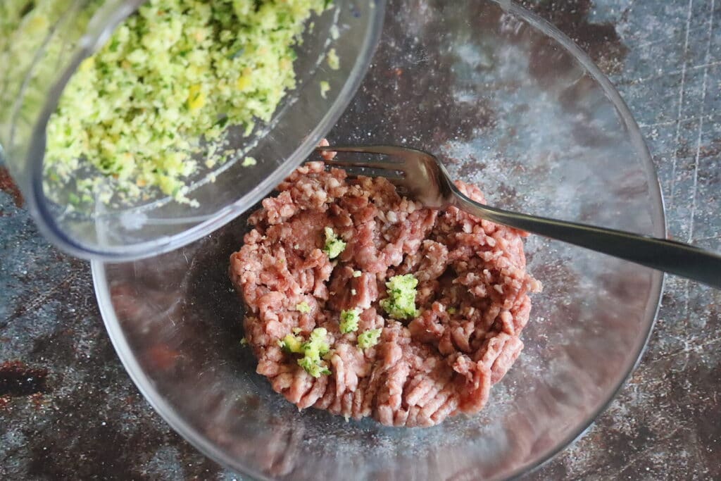 • In a large bowl, I mixed all the breadcrumb mixture with the ground meat.