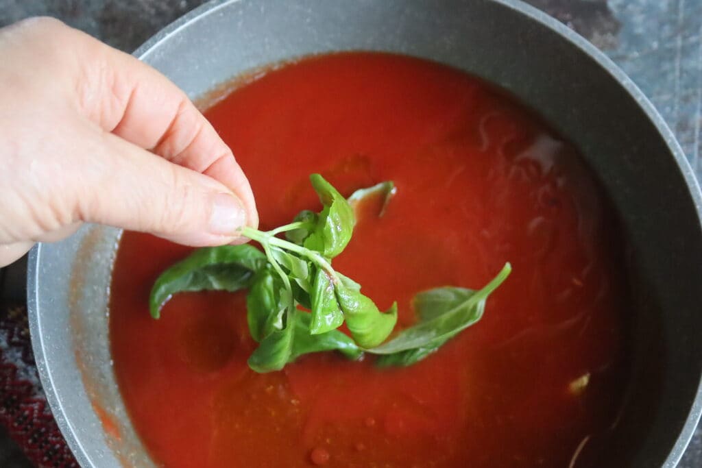 • Meanwhile, in a pan, I put everything together: garlic, extra virgin olive oil, tomato puree, and lots of basil, ten minutes of cooking, and
