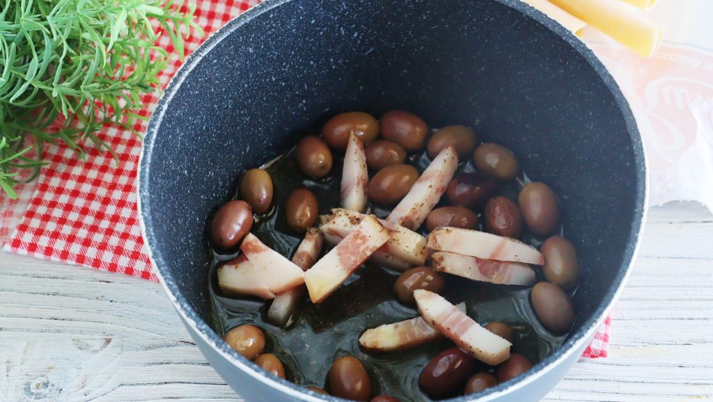 In the small pan with a little extra virgin olive oil, brown the guanciale with the olives.