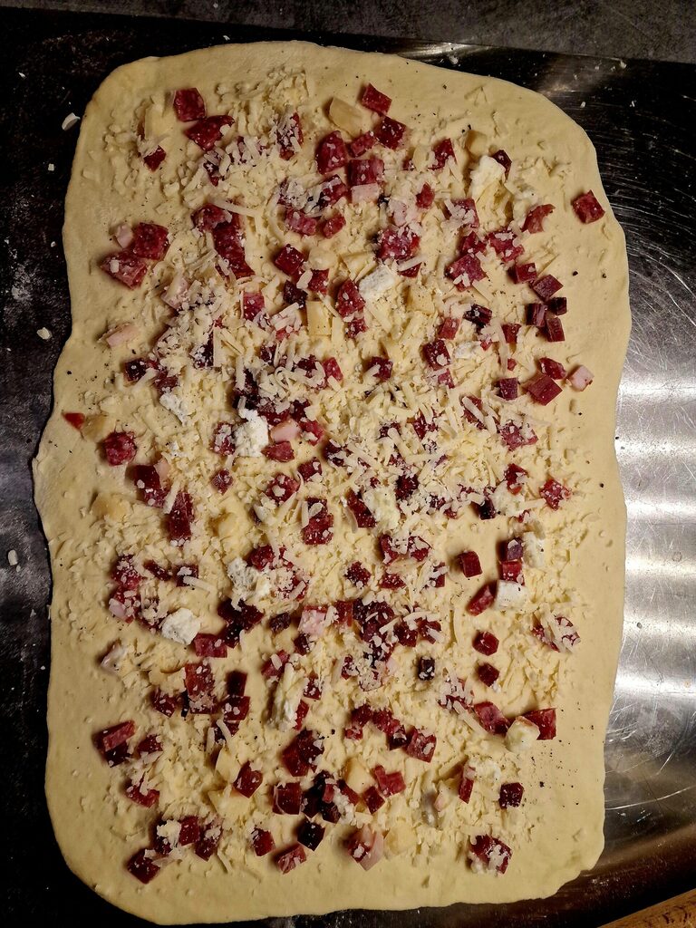 Roll out the dough on the work surface and cover it with mixed cold cuts and cheese, all cut into cubes, press them lightly with the rolling pin, also distribute the grated Parmesan and freshly ground black pepper evenly.