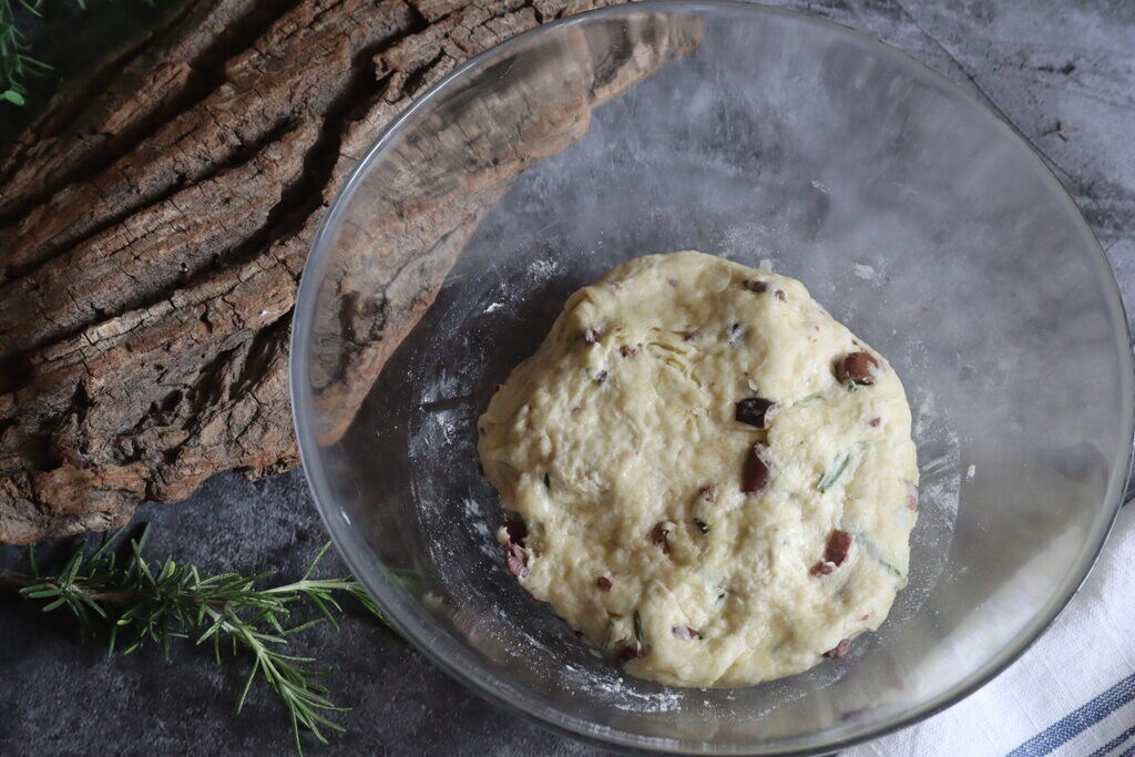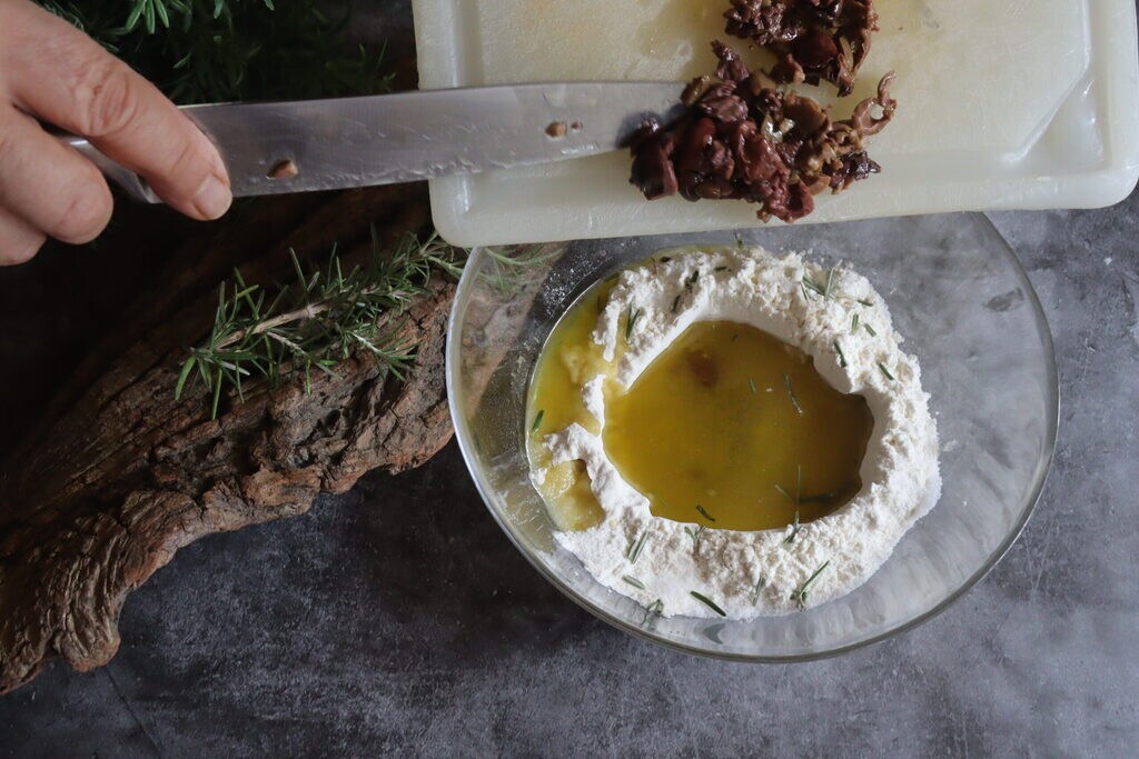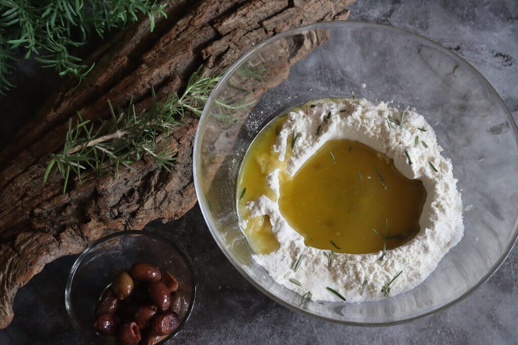 In the glass bowl, I combine all ingredients. Flour and salt, water and extra virgin olive oil, fresh chopped rosemary (otherwise dry is fine too).