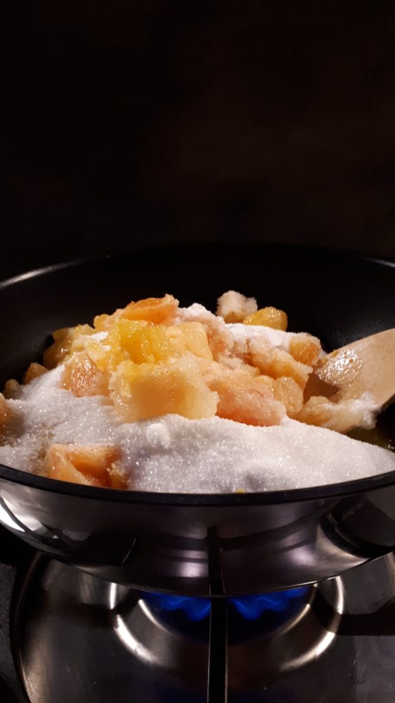 • Peel the oranges, slice them and remove the seeds. Put them in the pan with the sugar, mix the ingredients well.