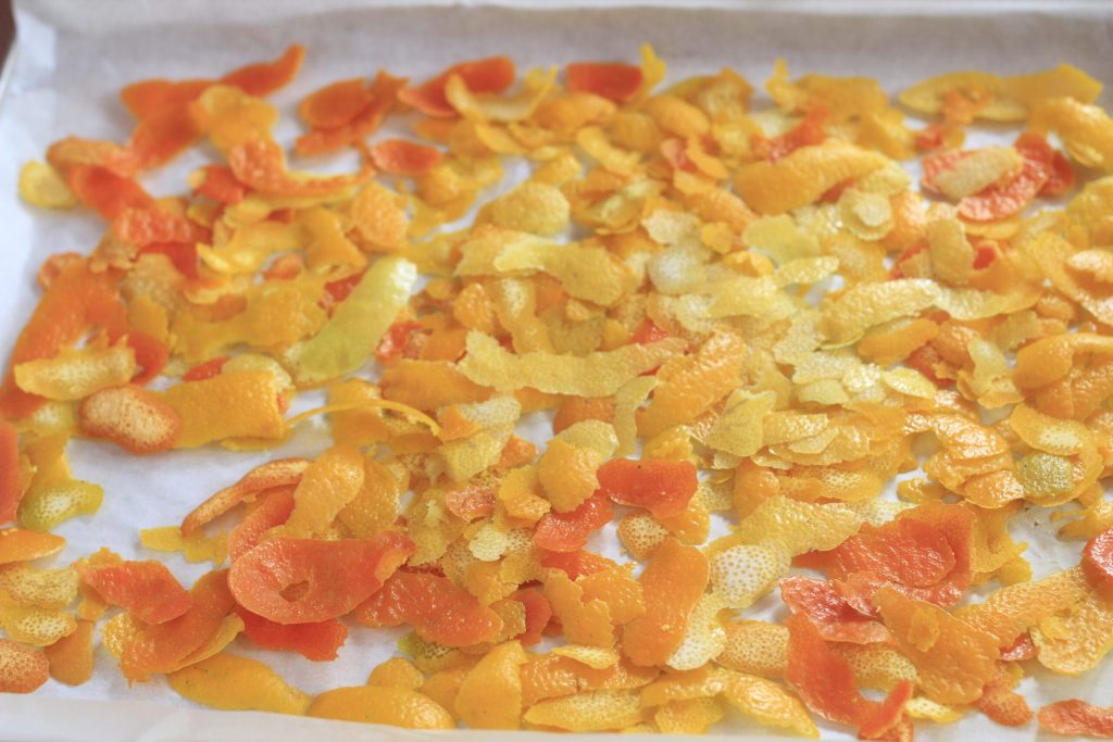 • As you see, I have arranged the orange peels on the baking tray with parchment paper. Let them dry for 2 hours in the oven at 175°F.