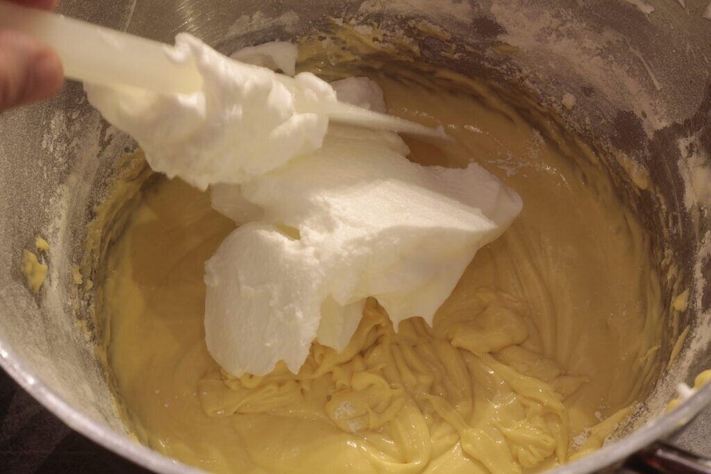 Sift the flour, baking powder, and cornstarch and add them to the batter, along with the vanilla essence and the grated lemon peel.